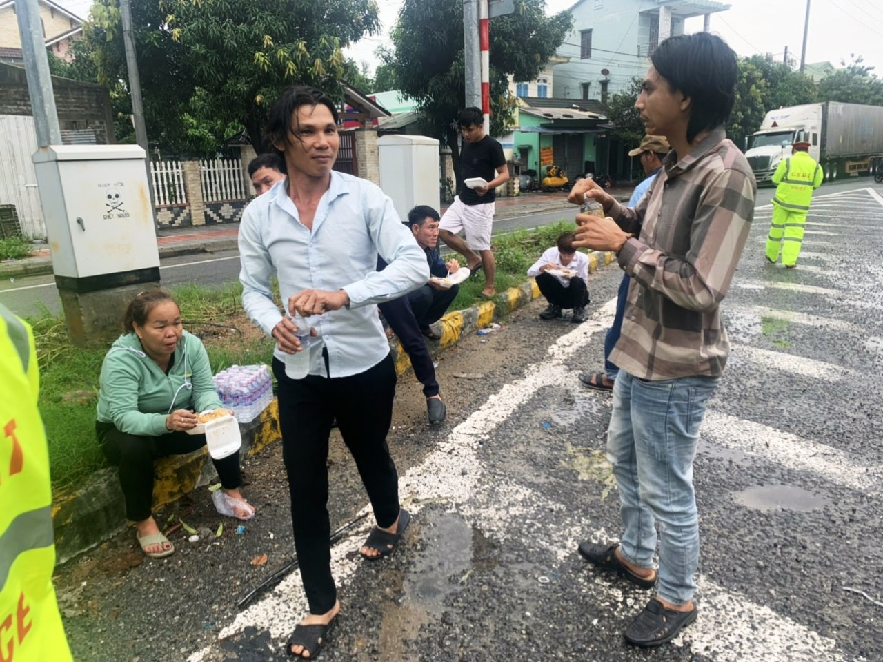 Với tinh thần tương thân, không để ai bị đói do kẹt lại trong mưa lũ, Trạm Cảnh sát Giao thông Phú Lộc đã phối hợp chính quyền, người dân thị trấn Lăng Cô tổ chức đặt nấu, cấp phát hơn 1.000 suất cơm hộp, mì ổ, nước uống đến hành khách, tài xế bị kẹt xe.