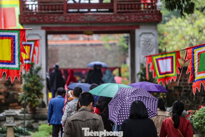 Dòng người đổ về Văn Miếu với ô che mưa.