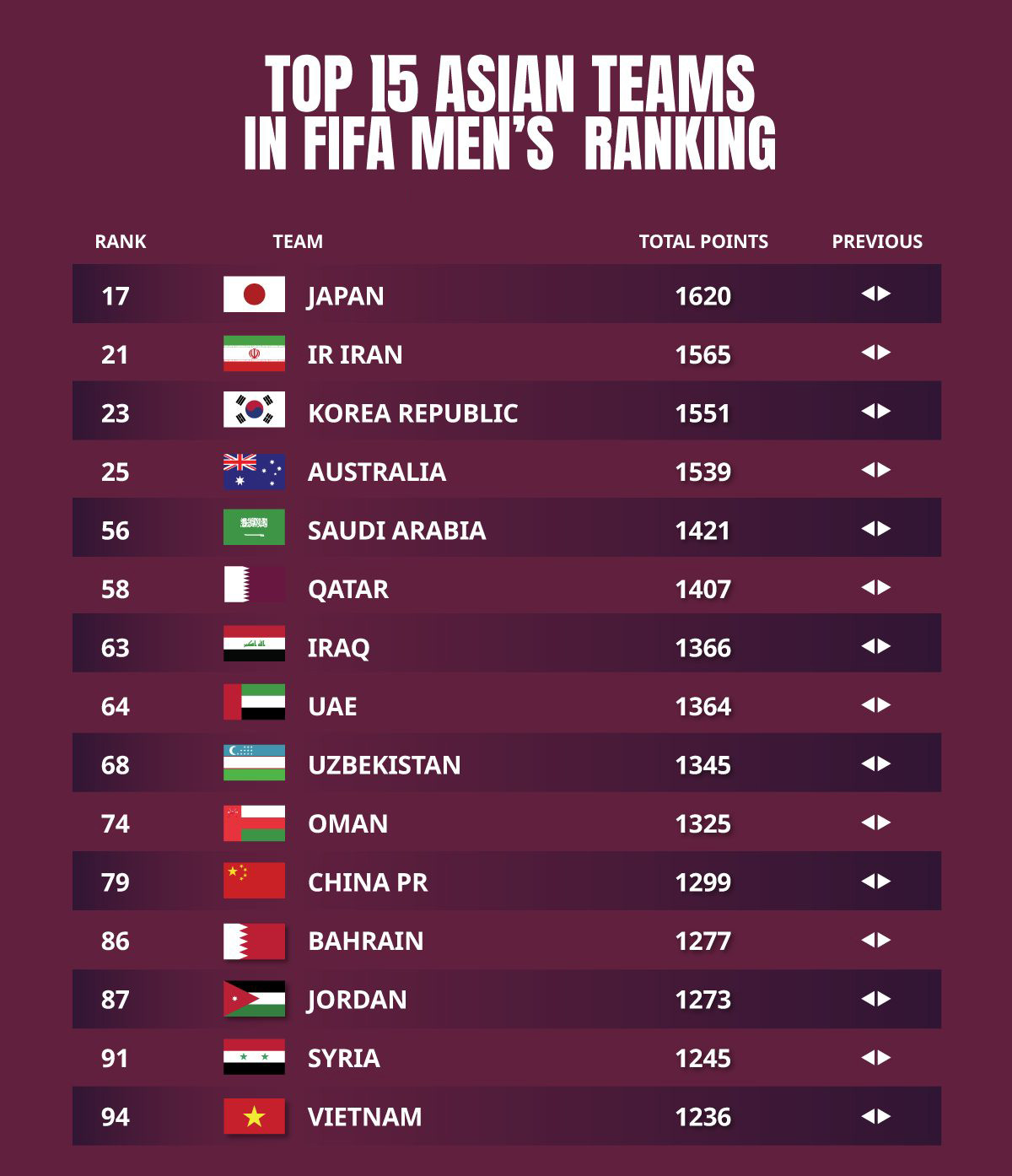 Ở khu vực châu Á, top 5 vẫn là Nhật Bản (hạng 17 thế giới), Iran (hạng 21 thế giới), Hàn Quốc (hạng 23 thế giới), Australia (hạng 25 thế giới) và Ả rập Xê Út (hạng 56 thế giới).