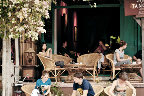 Tận hưởng cảm giác thư thái trong quán cà phê dưới tán hoa giấy ở Luang Prabang.