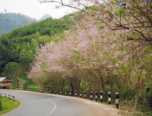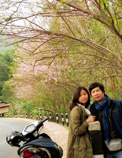 Cung đường phủ đầy hoa đào đậu tím ngắt, nên thơ hiện lên dưới ống kính những tâm hồn ưa xê dịch