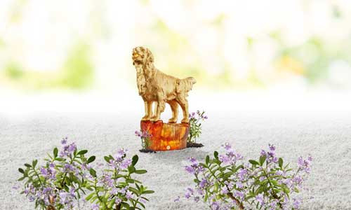 Tượng chó may mắn với giống chó Poodle vui sướng dẫm chân lên các đồng tiền vàng, như một điềm may hứa hẹn tiền tài sẽ đến từ mọi hướng