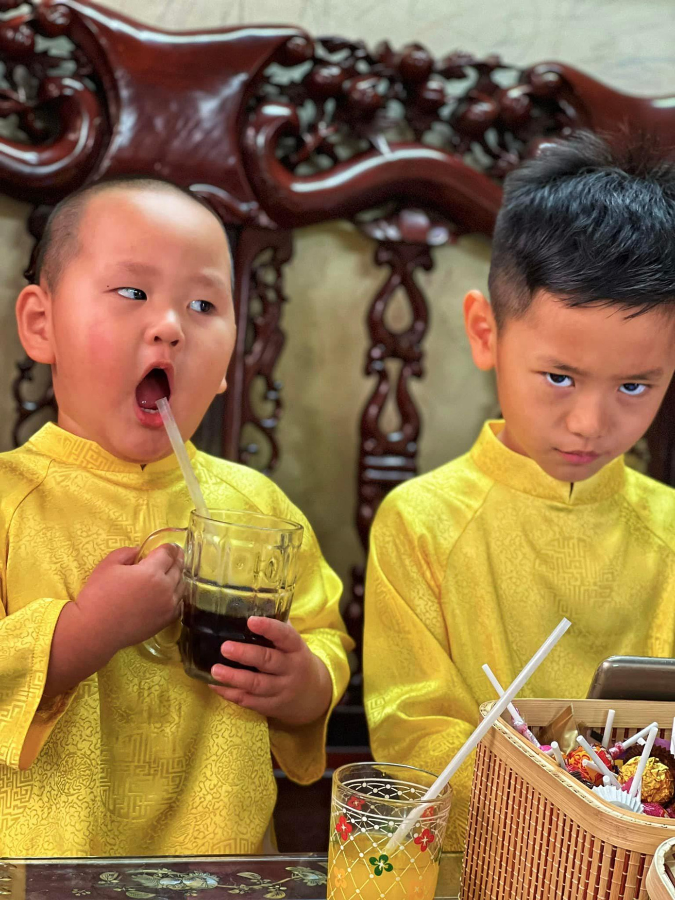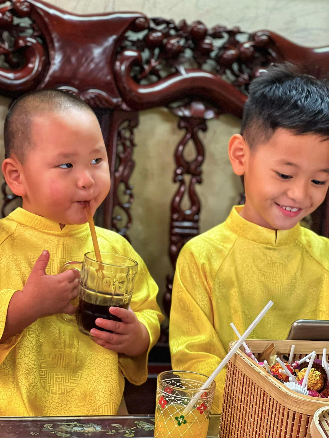 Vốn được biết đến là nhóc tỳ có niềm đam mê bất tận với đồ ăn, Hayden đón Tết Nhâm Dần bằng loạt ảnh "lầy lội" bên cạnh anh trai Harry. Cậu út nhà Trà My Idol đáng yêu trong tà áo dài vàng, biểu cảm tươi hết nấc với ly nước ngọt trong tay. Vẻ mặt tận hưởng thức uống cùng gương mặt bầu bĩnh của nhóc tỳ khiến dân tình "đổ cái rầm".