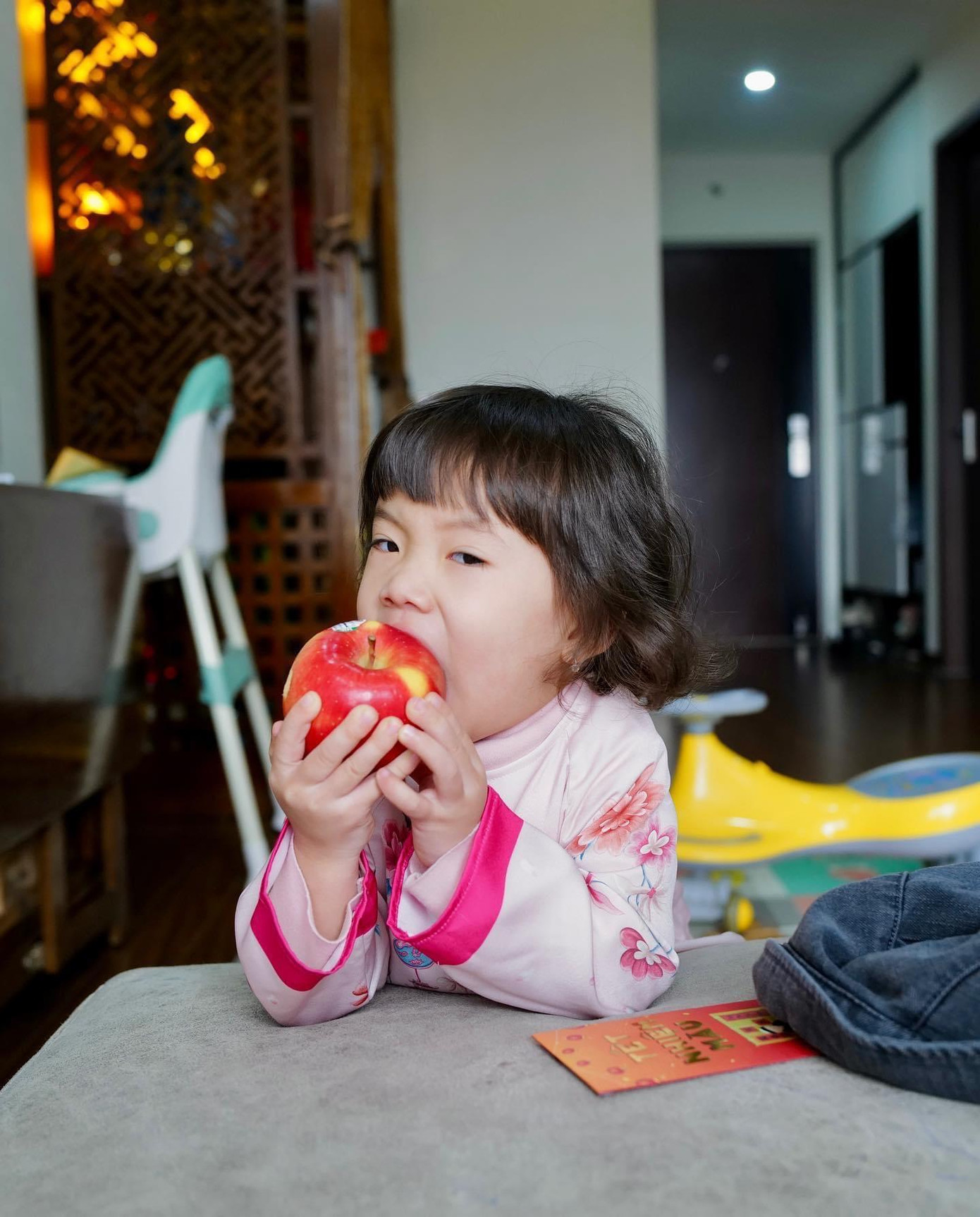 Biểu cảm của cô bé kết hợp với dòng caption cực "chất" của bố mẹ: "Quả táo thường đến sớm, nên hãy ăn nó" khiến dân tình bật cười thích thú.