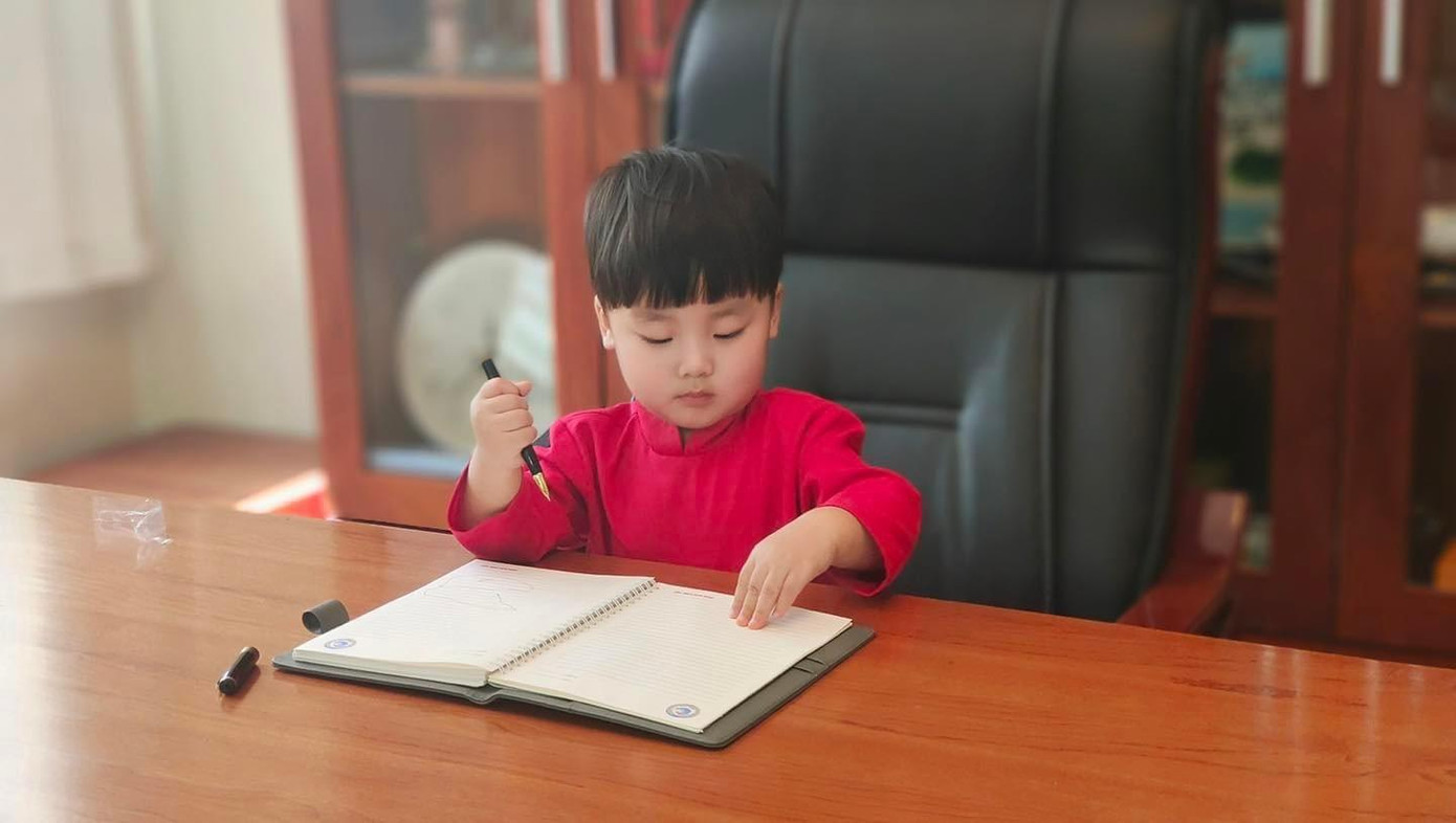 Bé Bo nhà Hòa Minzy khai bút đầu năm với hình ảnh ký hợp đồng như chủ tịch.