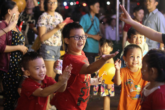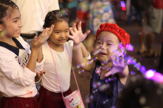 Nhiều trẻ em thích thú chơi đùa với bọt tuyết được trang trí tại Diamond Plaza, quận 1.
