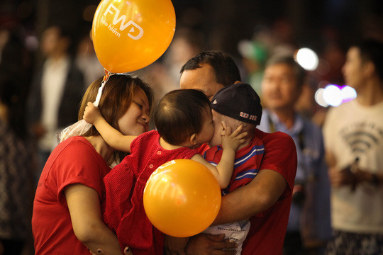 Gia đình anh Trọng tranh thủ ghi lại khoảng khắc "tuyết" rơi giữa lòng thành phố.