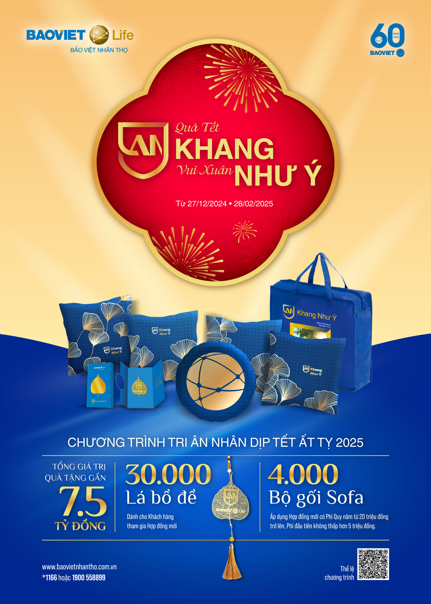 Đồng hành cùng các gia đình Việt đón xuân an khang và kỷ niệm 60 năm Bảo Việt, Bảo Việt Nhân thọ tưng bừng triển khai chương trình tri ân đặc biệt “Quà tết an khang, vui xuân như ý” với tổng giá trị quà tặng lên đến 7,5 tỷ đồng. Chương trình được triển khai trên toàn quốc từ ngày 27/12/2024 đến hết 28/2/2025. Theo đó, Bảo Việt Nhân thọ dành tặng 30.000 lá bồ đề An Khang - biểu tượng của sự bình an, sức khỏe và an lành cho các khách hàng tham gia hợp đồng bảo hiểm nhân thọ mới trong thời gian diễn ra chương trình. Đặc biệt, 4.000 bộ gối sofa cao cấp in hình lá ngân hạnh – biểu tượng của sự trường thọ và bình an – cũng sẽ được trao tặng cho các hợp đồng có mức phí đóng hàng năm từ 20 triệu đồng trở lên và đáp ứng các điều kiện của chương trình. (Chi tiết thể lệ xem tại đây: https://bit.ly/quatetankhang-bao)