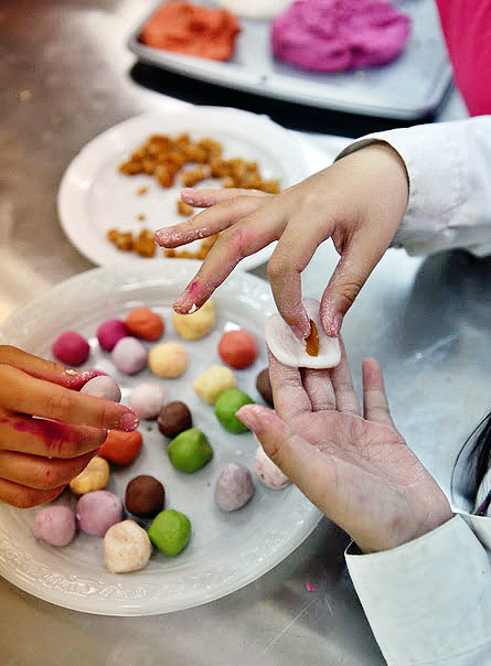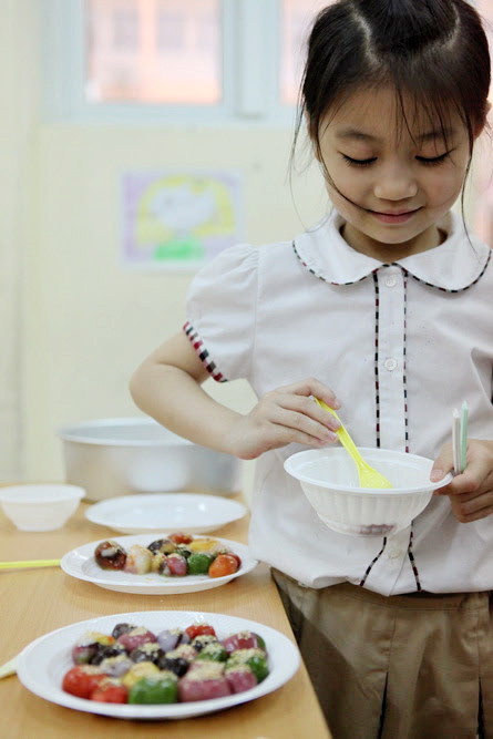 Những đĩa bánh trôi bảy màu độc đáo và bắt mắt được các em nhỏ hoàn thành trong bài học ngoại khóa.