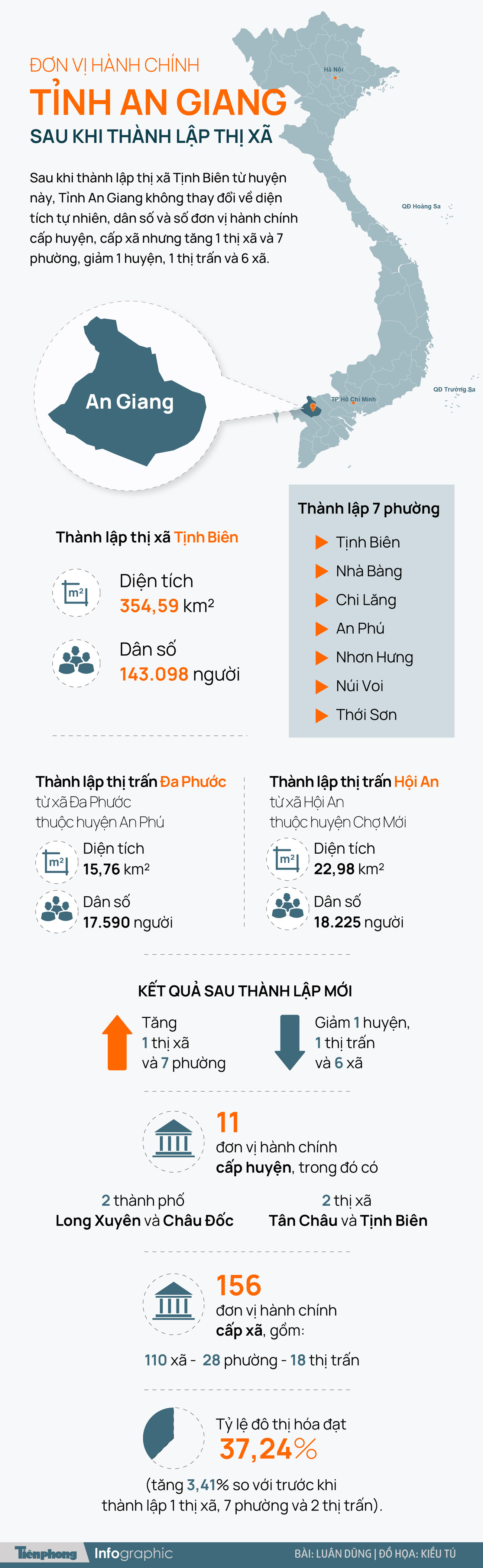 TPO - Sau khi thành lập thị xã Tịnh Biên từ huyện này, Tỉnh An Giang không thay đổi về diện tích tự nhiên, dân số và số đơn vị hành chính cấp huyện, cấp xã nhưng tăng 1 thị xã và 7 phường, giảm 1 huyện, 1 thị trấn và 6 xã .
