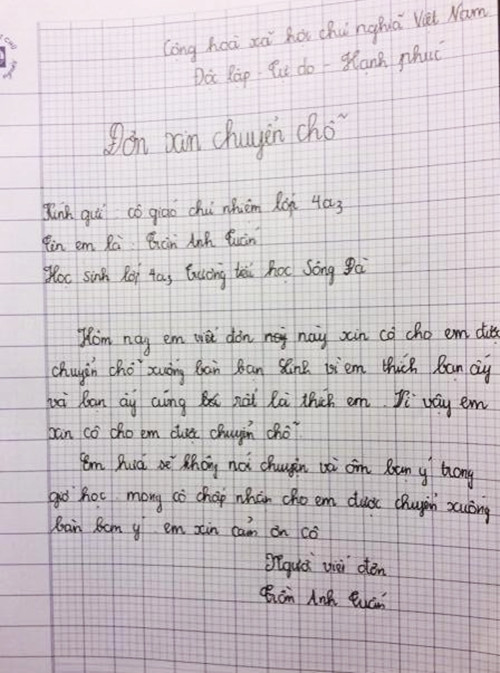 Đơn xin chuyển chỗ gần 'người yêu' của học sinh lớp 4