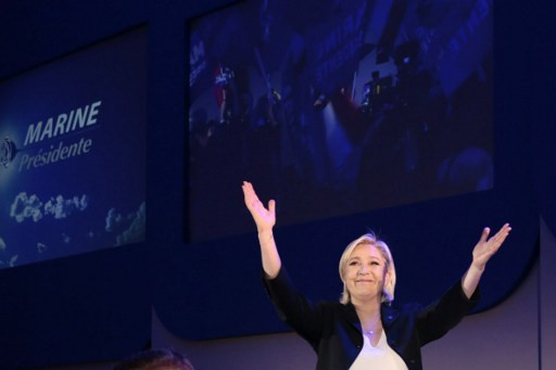 Ứng viên Tổng thống Pháp của đảng Mặt trận Quốc gia Marine Le Pen phát biểu ở Henin-Beaumont hôm 23/4 sau khi chiến thắng vòng bầu cử đầu tiên.
