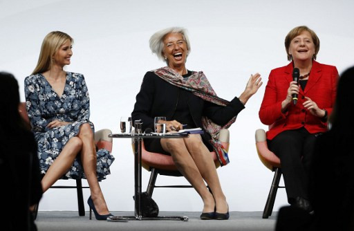 Từ trái sang, cô Ivanka Trump, con gái và là cố vấn Tổng thống Mỹ, bà Christine Lagarde, Tổng giám đốc Quỹ Tiền tệ Quốc tế (IMF), bà Angela Merkel, Thủ tướng Đức trong hội nghị thượng đỉnh về quyền phụ nữ tổ chức tại Berlin hôm 25/4.