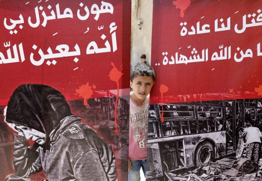Một em bé ngó đầu qua tấm poster trong một lễ tang ở nhà thờ Sayyida Zeinab, ngoại ô Damascus hôm 26/4. Tang lễ được tổ chức cho các nạn nhân vụ đánh bom nhằm vào đoàn xe bus chở người sơ tán khỏi 2 khu vực đang bị phiến quân chiếm đóng là Fuaa và Kafraya. Đây là một trong những vụ đánh bom tự sát khủng khiếp nhất trong suốt 6 năm nội chiến Syria.
