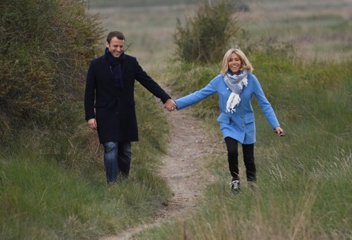 Ứng viên Tổng thống Pháp của đảng Tiến lên, ông Emmanuel Macron cùng vợ là bà Brigitte Trogneux tạo dáng chụp ảnh hôm 22/4 ở Le Touquet, miền bắc nước Pháp France.