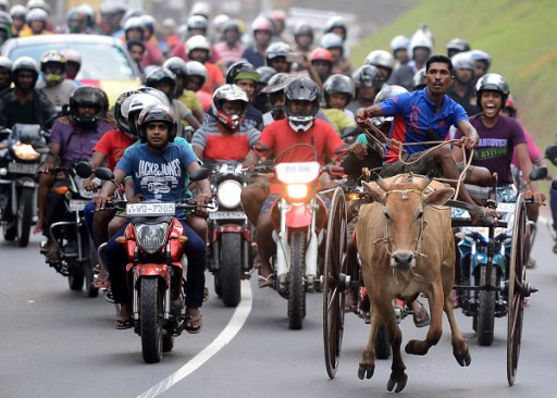 Một người lái xe bò Sri Lanka trong cuộc đua bò truyền thống mừng năm mới Sri Lanka ở Homagama hôm 23/4.