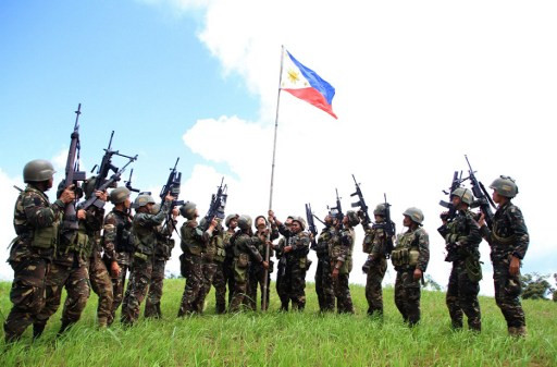 Binh sỹ Philippine giương cao cờ sau trận đánh với phiến quân có liên quan đến tổ chức IS ở thị trấn Piagapo, tỉnh Lanao del Sur, phía nam hòn đảo Mindanao hôm 25/4. Quân đội Philippine hôm 25/4 cho biết, 40 phiến quân đã bị tiêu diệt trong trong chiến dịch này.