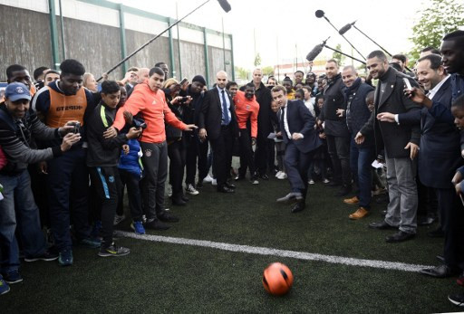 Ứng viên Tổng thống Pháp Emmanuel Macron của đảng Tiến lên đá bóng trong cuộc vận động tranh cử ở Sarcelles, phía bắc Paris hôm 27/4.