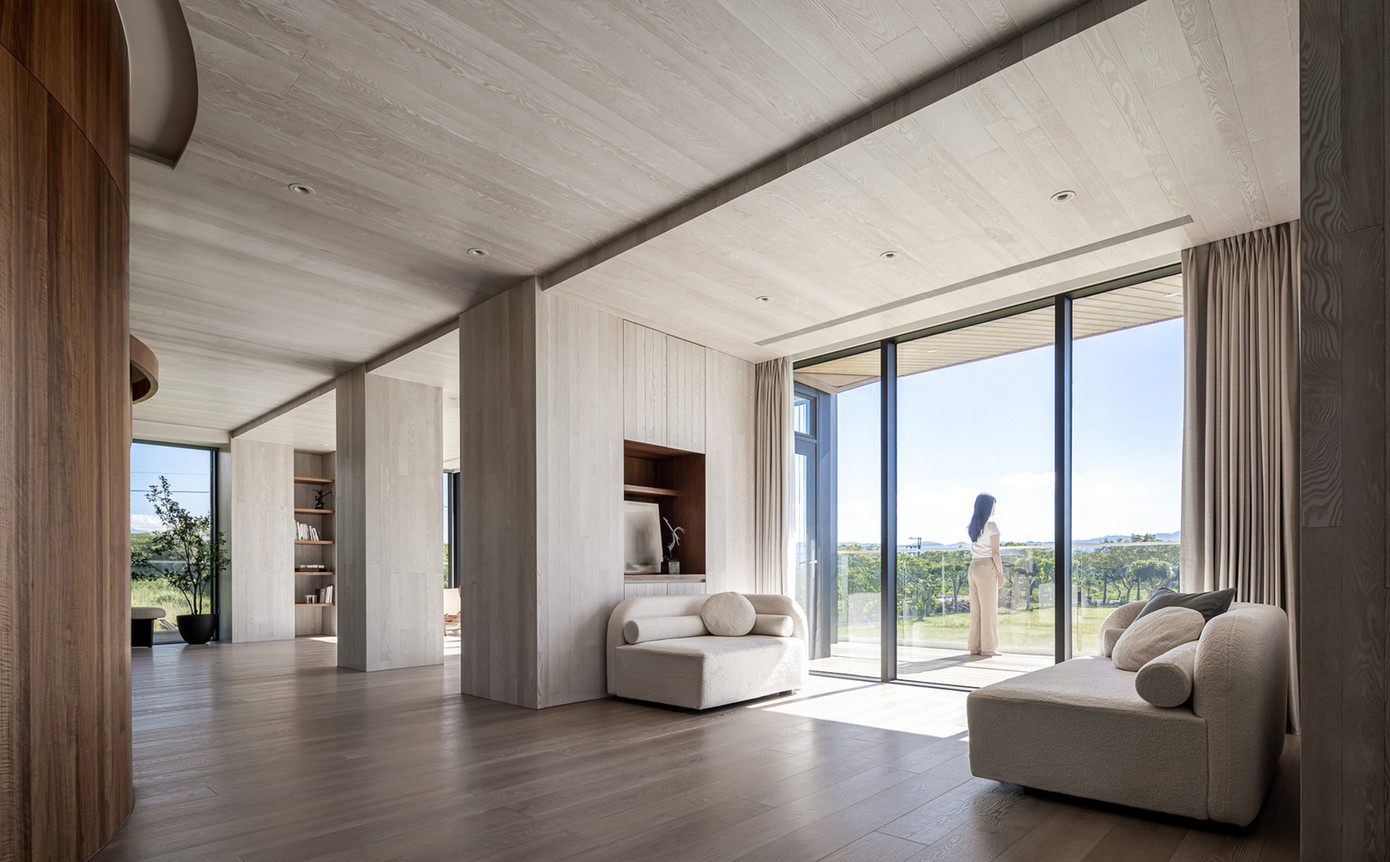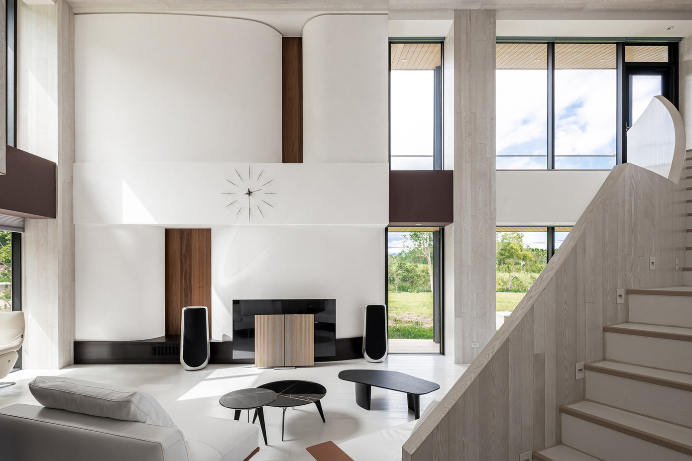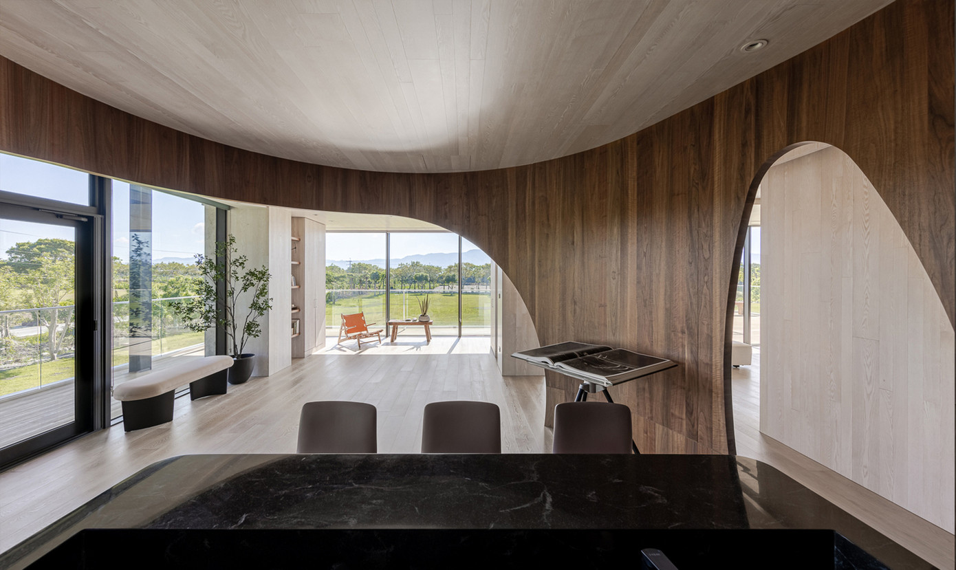 Bên cạnh nét hài hòa được tạo nên bởi những đường cong linh hoạt, kiến trúc tổng thể căn nhà cũng làm mờ đi ranh giới trong - ngoài, kết nối liền mạch với thiên nhiên và tối ưu ánh sáng mặt trời nhờ hệ cửa kính lớn từ sàn lên đến trần.