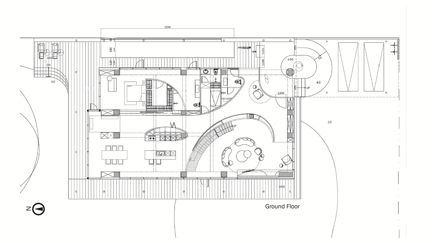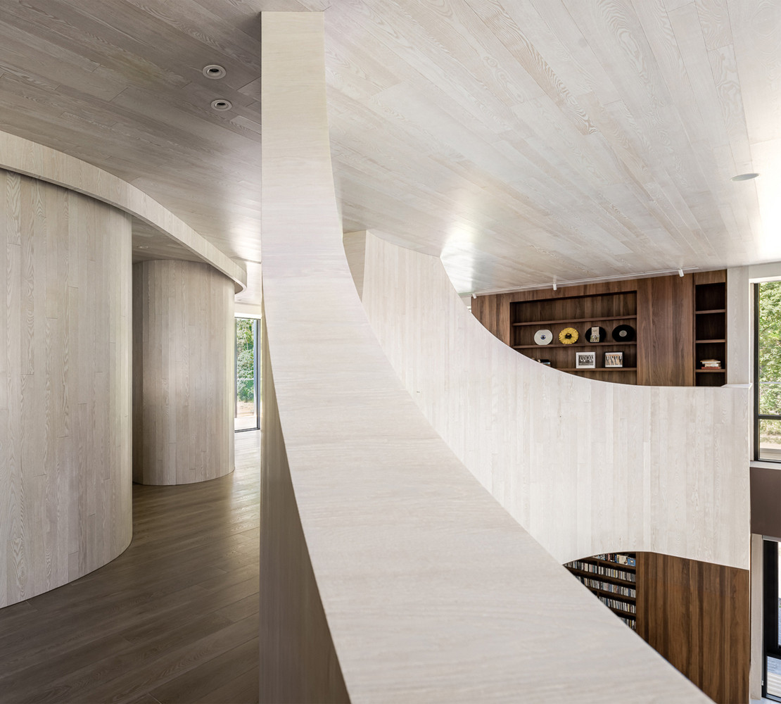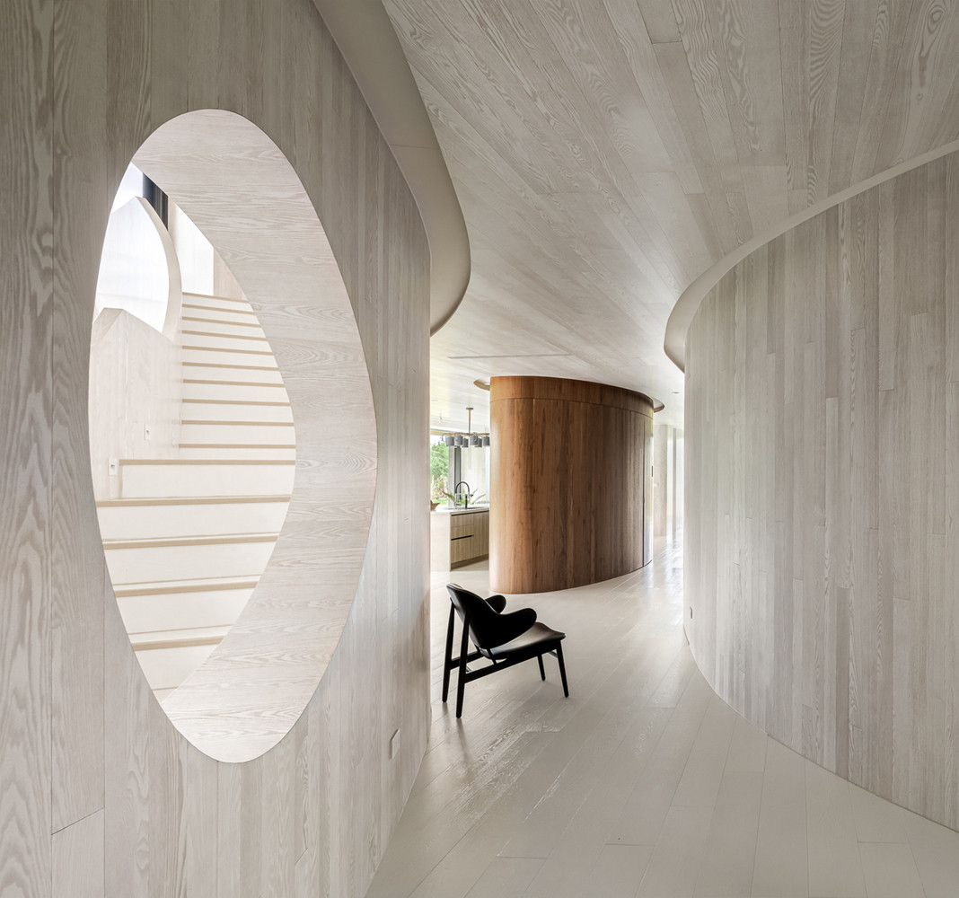 Bên cạnh nét hài hòa được tạo nên bởi những đường cong linh hoạt, kiến trúc tổng thể căn nhà cũng làm mờ đi ranh giới trong - ngoài, kết nối liền mạch với thiên nhiên và tối ưu ánh sáng mặt trời nhờ hệ cửa kính lớn từ sàn lên đến trần.