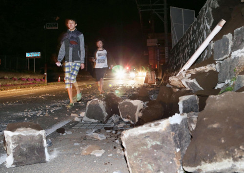 Kênh NHK chiếu cảnh tòa thị chính Mashiki chìm trong bóng tối, dường như bị mất điện, những đống đổ nát trên đường, những mảnh kính và cửa sổ vỡ, lửa tóe lên ở một số nơi và lính cứu hỏa đang khống chế một đám cháy.