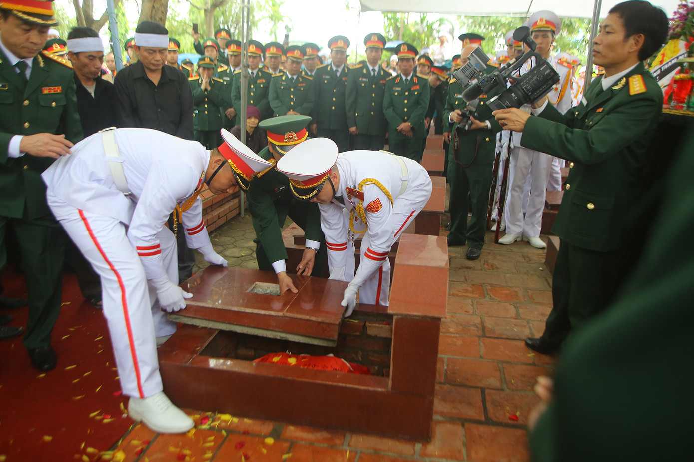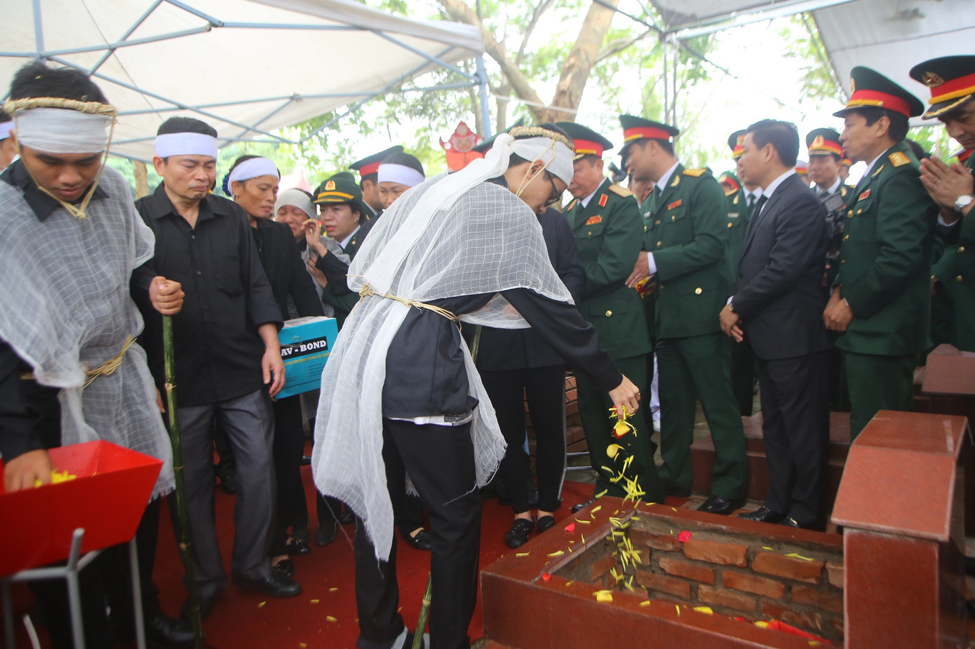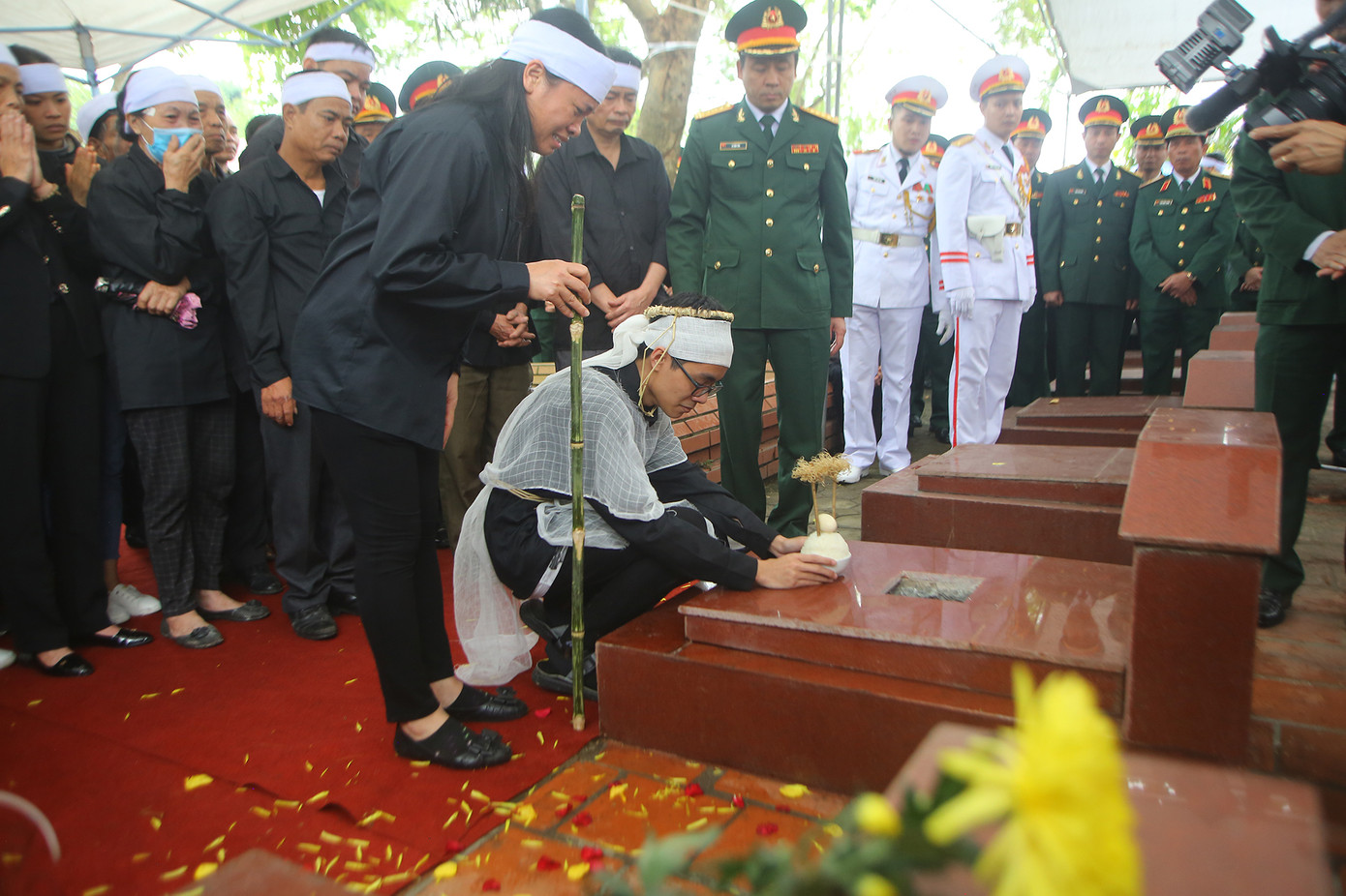 Con trai út của Tướng Hùng rải hoa lên mộ phần bố.