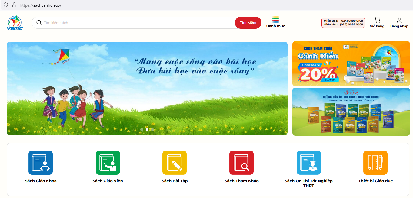 Nhằm đáp ứng nhu cầu tìm mua sách giáo khoa Cánh Diều chuẩn bị cho năm học mới của Quý Phụ huynh, Học sinh và Quý Thầy Cô giáo; đồng thời, mong muốn được cung cấp dịch vụ tốt nhất đến Quý khách hàng, tránh để xảy ra tình trạng sốt sách thiếu sách trên thị trường, Công ty VEPIC cho ra mắt trang thương mại điện tử http://sachcanhdieu.vn với đầy đủ tất cả các sản phẩm giáo dục Cánh Diều bao gồm: sách giáo khoa, sách giáo viên, sách bài tập, sách tham khảo thiết yếu và thiết bị, đồ dùng học tập từ lớp 1 đến lớp 12.
