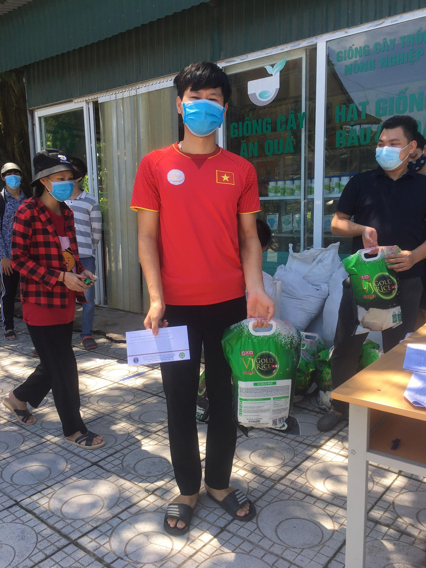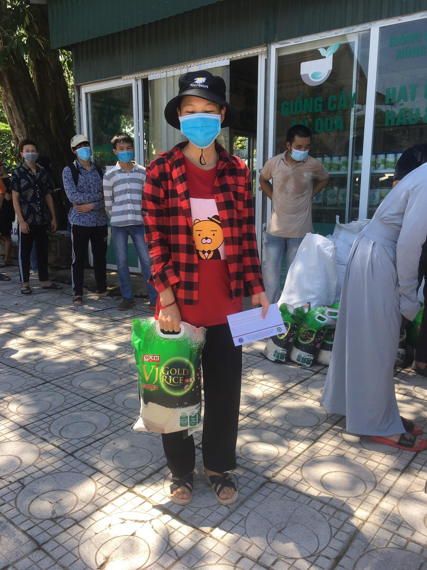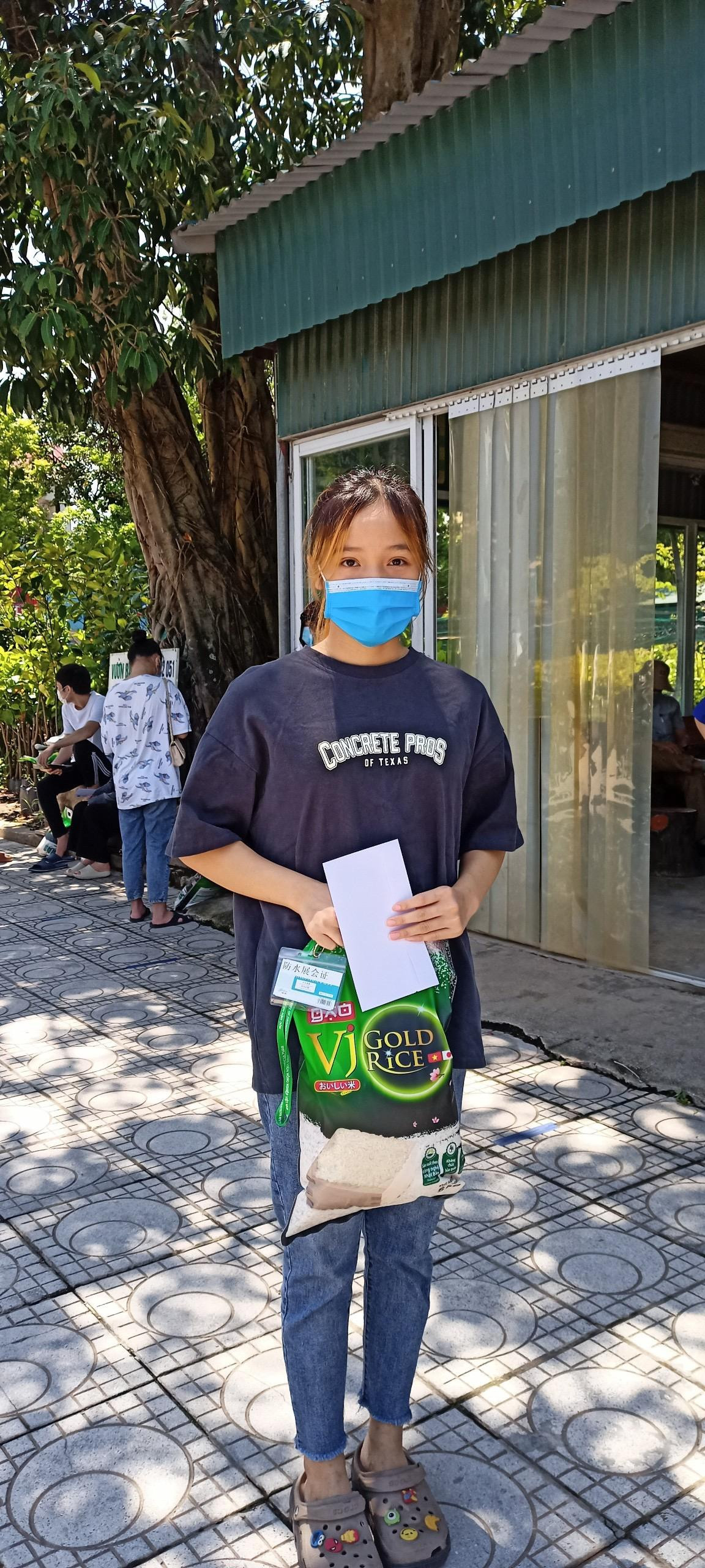 | Sinh viên thực hiện 5K và đứng giãn cách khi đi tiếp nhận hỗ trợ |