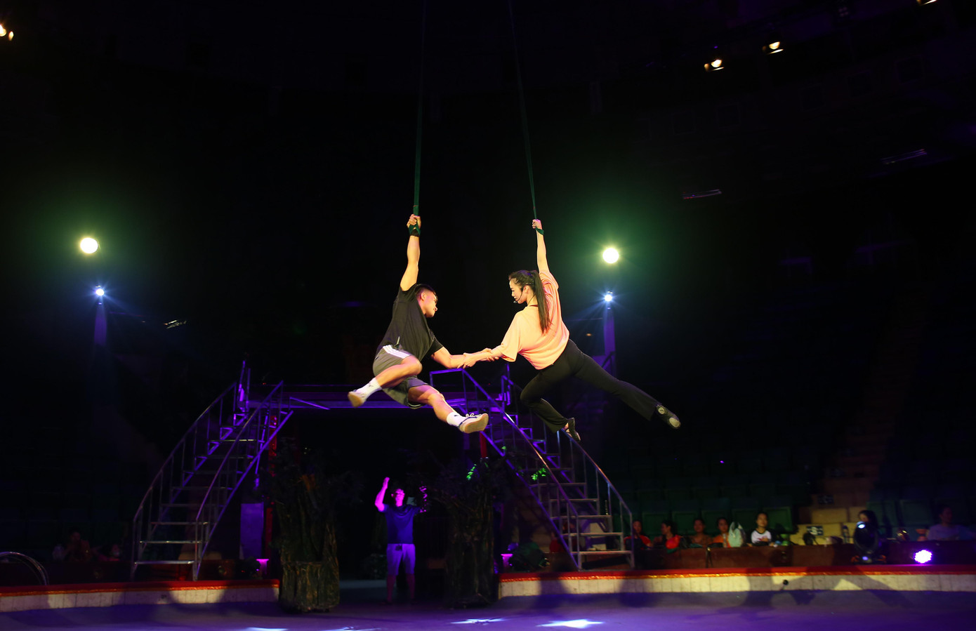 | 11 năm gắn bó với Xiếc, Ngọc Diệp trình diễn những động tác đu dây và nhào lộn một cách đầy tự tin. |