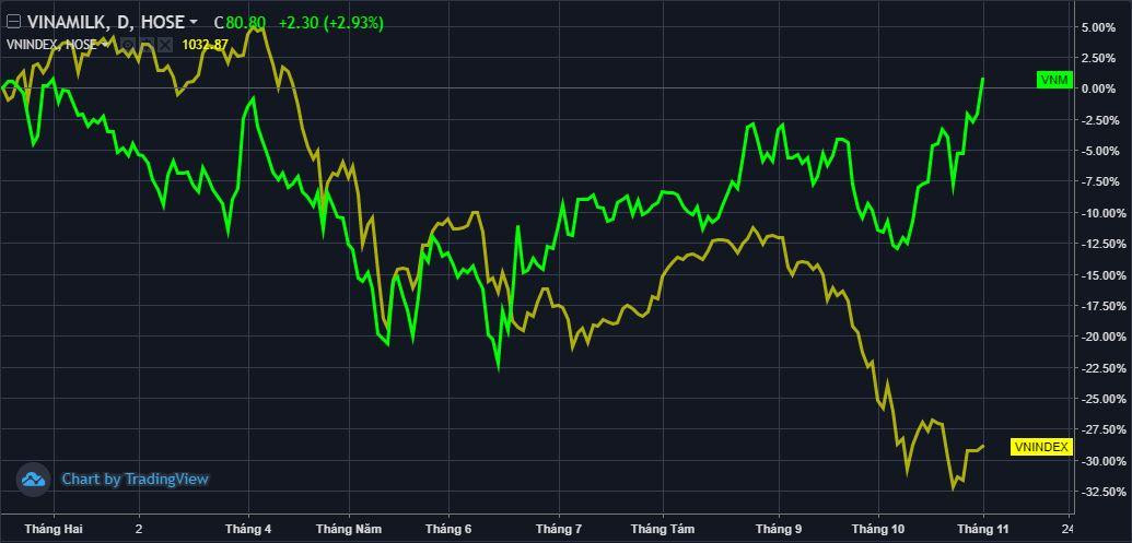 Thời gian gần đây, nhà đầu tư cũng đã không còn xa lạ với việc cổ phiếu VNM thường xuyên đóng vai trò dẫn dắt, thậm chí ngược dòng ngoạn mục để “gánh” chỉ số. Trong bối cảnh thị trường liên tục sụt giảm mạnh và có thời điểm xuống dưới mốc 1.000 điểm, VNM vẫn tăng gần 15% trong 1 tháng qua. Giá trị vốn hóa tương ứng tăng thêm 21.500 tỷ đồng kể từ đầu tháng 10, đạt xấp xỉ 170.000 tỷ đồng và nằm trong top các doanh nghiệp giá trị nhất toàn sàn chứng khoán. Ngoài ra, VNM còn là cổ phiếu được khối ngoại mua ròng mạnh nhất thị trường trong tháng 10 với giá trị hơn 880 tỷ đồng.