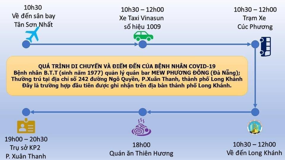 Cơ quan chức năng đã phong tỏa một bên đường Ngô Quyền (50m, hai bên nhà bệnh nhân), tạm thời đóng cửa quán ăn Hương Lan; Tiến hành phun khử khuẩn tại nhà bà T. và các hộ lân cận; Nhà xe Cúc Phương tại Long Khánh (địa chỉ: 28 Nguyễn Du, Xuân An, TP Long Khánh); Trụ sở KP.2 (đường Phạm Lạc, P.Xuân Thanh, TP.Long Khánh); Chi cục Thuế khu vực Long Khánh – Cẩm Mỹ; Trường tiểu học Lê Văn Tám (KP.3, P.Xuân Thanh, TP.Long Khánh); Nhà của các trường hợp F1 được chuyển cách ly tập trung.