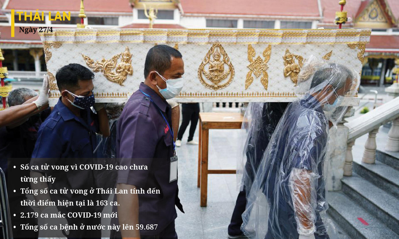 Thái Lan hôm nay, 27/4, ghi nhận số ca tử vong vì COVID-19 cao chưa từng thấy, với 15 ca (trong đó có 9 người ở thủ đô Bangkok). Đây là lần lập kỉ lục thứ ba của Thái Lan chỉ trong vòng bốn ngày. Tổng số ca tử vong ở Thái Lan tính đến thời điểm hiện tại là 163 ca.