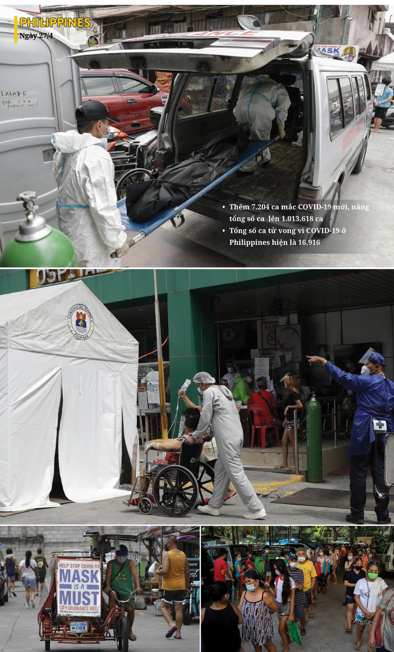 Quốc đảo Philippines hôm nay, 27/4, ghi nhận thêm 7.204 ca mắc COVID-19 mới, nâng tổng số ca bệnh lên 1.013.618 ca, vượt mốc một triệu ca.