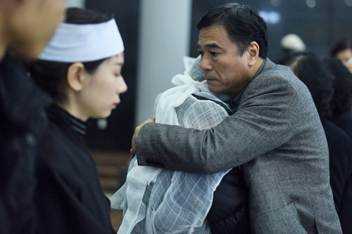Nghệ sĩ Phạm Cường đi quanh linh cữu để nhìn mặt cố diễn viên lần cuối.