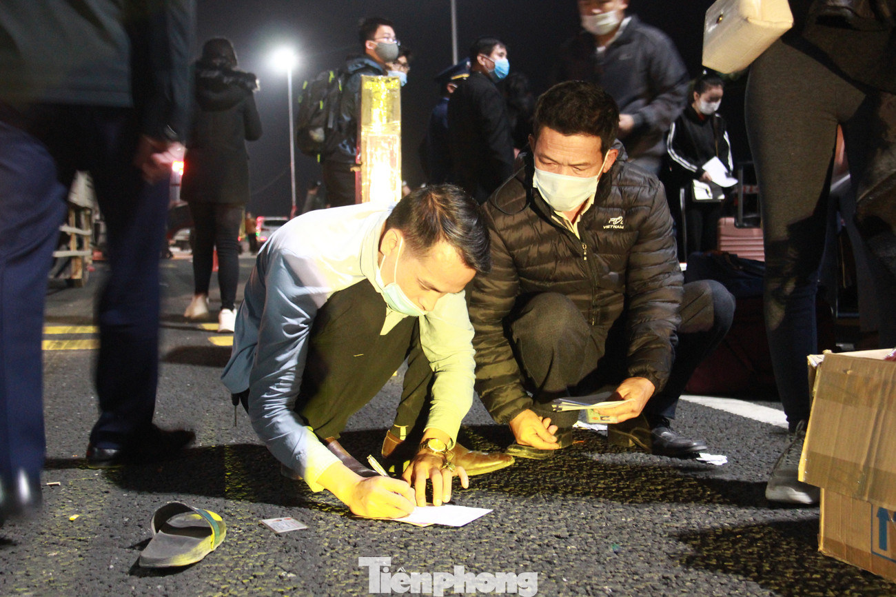 Với số lượng rất đông, nhiều người phải dùng mọi biện pháp để có thể khai báo y tế. Như bạn nam này phải khai báo y tế ngay giữa mặt đường, bác tài xế bên cạnh chờ để mượn bút tiếp tục khai báo