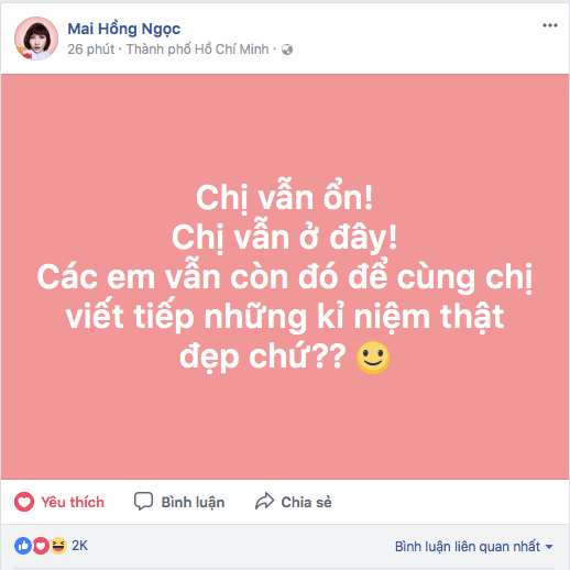 Mới đây, sau một thời gian “đóng cửa” trang cá nhân, Đông Nhi đã có động thái “mở lại” và liền sau đó là gửi lời an ủi đến người hâm mộ. Giọng ca Vì ai vì anh tâm sự: “Chị vẫn ổn! Chị vẫn ở đây! Các em vẫn còn đó để cùng chị viết tiếp những kỷ niệm thật đẹp chứ?”