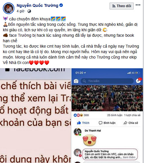 Vừa mới đây, thông qua trang cá nhân có hơn 300 nghìn người theo dõi của mình, diễn viên Quốc Trường (vai Vũ phim "Về nhà đi con") đã thông báo việc tài khoản facebook của anh vừa bị hack nhưng may mắn đã lấy lại được, mặc dù vậy một số tính năng như like hay bình luận đang bị hạn chế thu hút sự quan tâm của nhiều người hâm mộ .