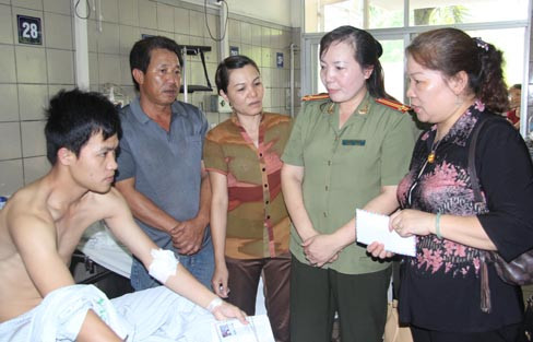 Bà Trương Thị Mai Lương, Phó Chủ tịch Công đoàn Công an Nhân dân và bà Thái Thị Sơn, cán bộ phụ trách công tác xã hội của tập đoàn TH đã ân cần thăm hỏi sức khỏe từng chiến sĩ và bày tỏ sự cảm phục về tinh thần dũng cảm của những chiến sỹ Cảnh sát phòng cháy chữa cháy Thủ đô.