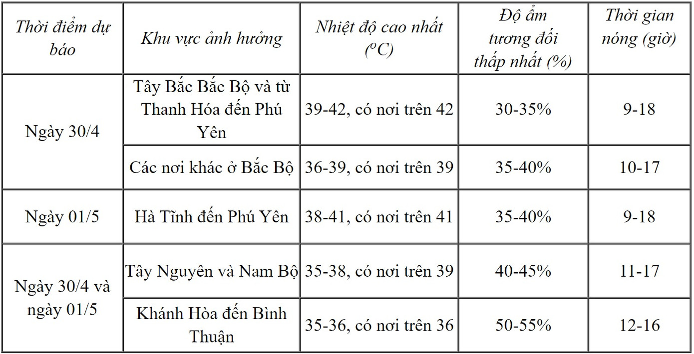 Trung tâm dự báo Khí tượng thủy văn quốc gia dự báo trong 24 giờ đến 48 giờ tới, khu vực từ Thanh Hóa đến Phú Yên có nắng nóng đặc biệt gay gắt với nhiệt độ cao nhất phổ biến từ 39-42 độ, có nơi trên 42 độ; độ ẩm tương đối thấp nhất phổ biến từ 30-40%. Riêng Thanh Hóa, Nghệ An ngày 1/5, nắng nóng suy giảm.
