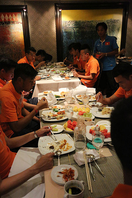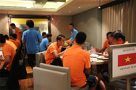 Các cầu thủ Việt Nam được xếp ngồi riêng một khu vực để thuận tiện cho việc ăn uống.