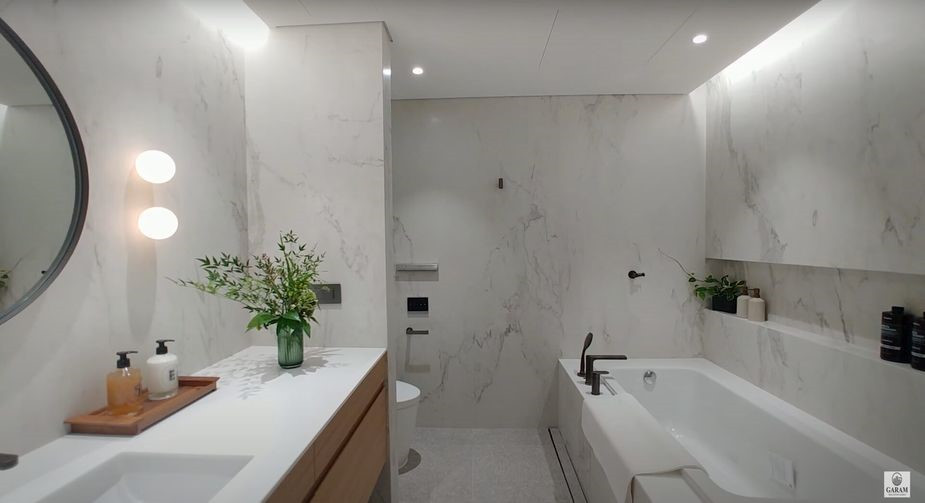 | Phong cách hiện đại của phòng tắm và tủ quần áo không cửa ngăn làm tăng thêm khái niệm sang trọng và tối giản. |