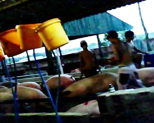 Những con heo chừng 95 - 110 kg được thợ bơm thúc lại gần thành chuồng rồi dùng dây dù cột chặt hàm phía trên, siết chặt vào thành sắt. Heo càng quẫy đạp, dây dù càng siết chặt mõm heo với thành chuồng. Con nào phản kháng sẽ bị thợ đạp cho phủ phục xuống nền rồi kéo lê lại sát thành.