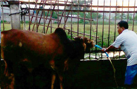 Đến giờ bơm nước, lái bò tên Đục lần lượt buộc năm con bò vào tường rào cạnh hai vòi nước. Sau đó, Đục lấy một ống nước nhựa dài khoảng 1,5 m màu xanh, to bằng cổ tay ra chỗ bò đang buộc rồi xả van nước. Với biệt danh “sát thủ” bơm nước nhanh và gọn, Đục kéo dây xỏ mũi bò vắt lên tường rào cho đầu bò ngẩng, miệng há. Không tốn chút sức nào, Đục thọc ống nước đang chảy xối xả vào họng bò. Lúc này con bò lắc mạnh đầu vùng vẫy nhưng dây buộc chặt, nó đành bất lực, đứng yên chịu trận.
