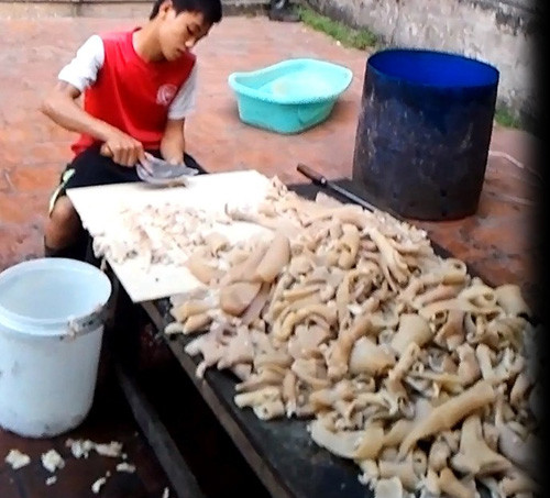 Theo bà N., mỗi chuyến hàng nhập về phải từ 6 - 8 tạ thì mới đủ để cơ sở của bà chế biến. Còn các cơ sở nhỏ lẻ trong thôn, nguyên liệu nhập về mỗi đợt cho từng hộ cũng ngót nghét cả tạ.