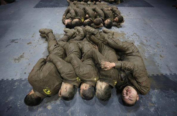 Học viên tranh thủ chợp mắt trong đợt huấn luyện cường độ cao. Họ phải ôm nhau ngủ để giữ ấm cơ thể.