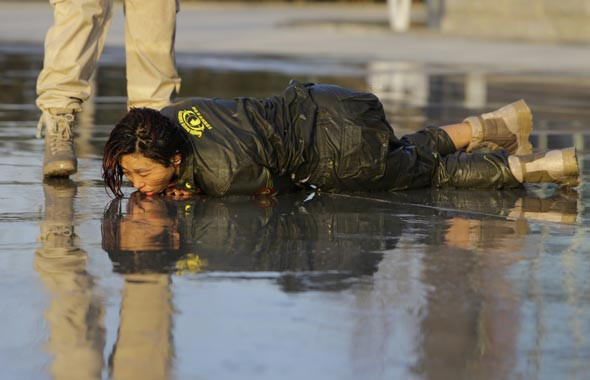 Học viên nữ nằm trên mặt đất trong buổi rèn luyện thể lực với nước lạnh.