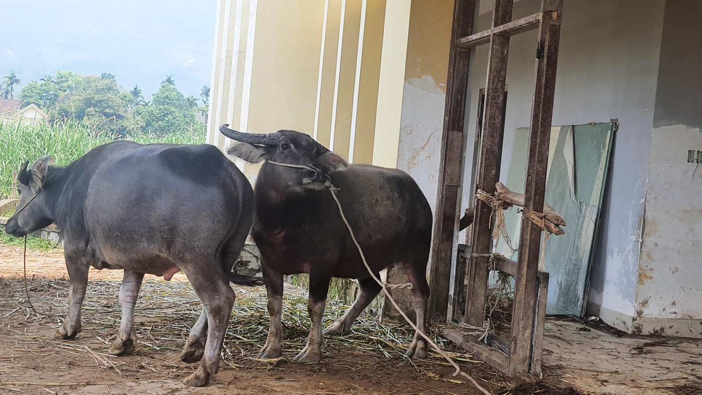 | Trâu được nuôi nhốt trên hành lang tầng trệt tòa nhà |
