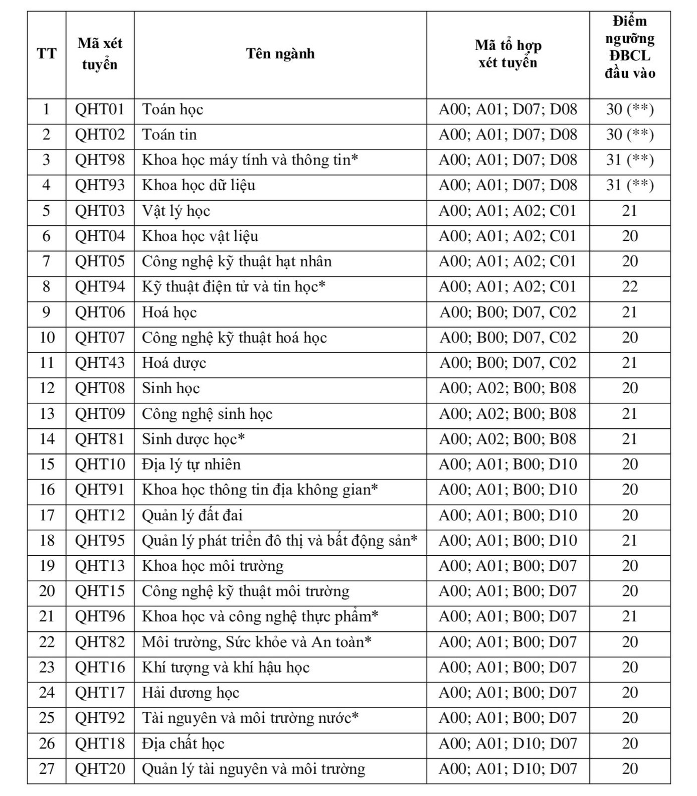 Hội đồng tuyển sinh đại học chính quy Trường Đại học Khoa học Tự nhiên thông báo điểm sàn nhận hồ sơ xét tuyển năm 2024 đối với phương thức sử dụng kết quả thi tốt nghiệp THPT năm 2024 của trường như sau: