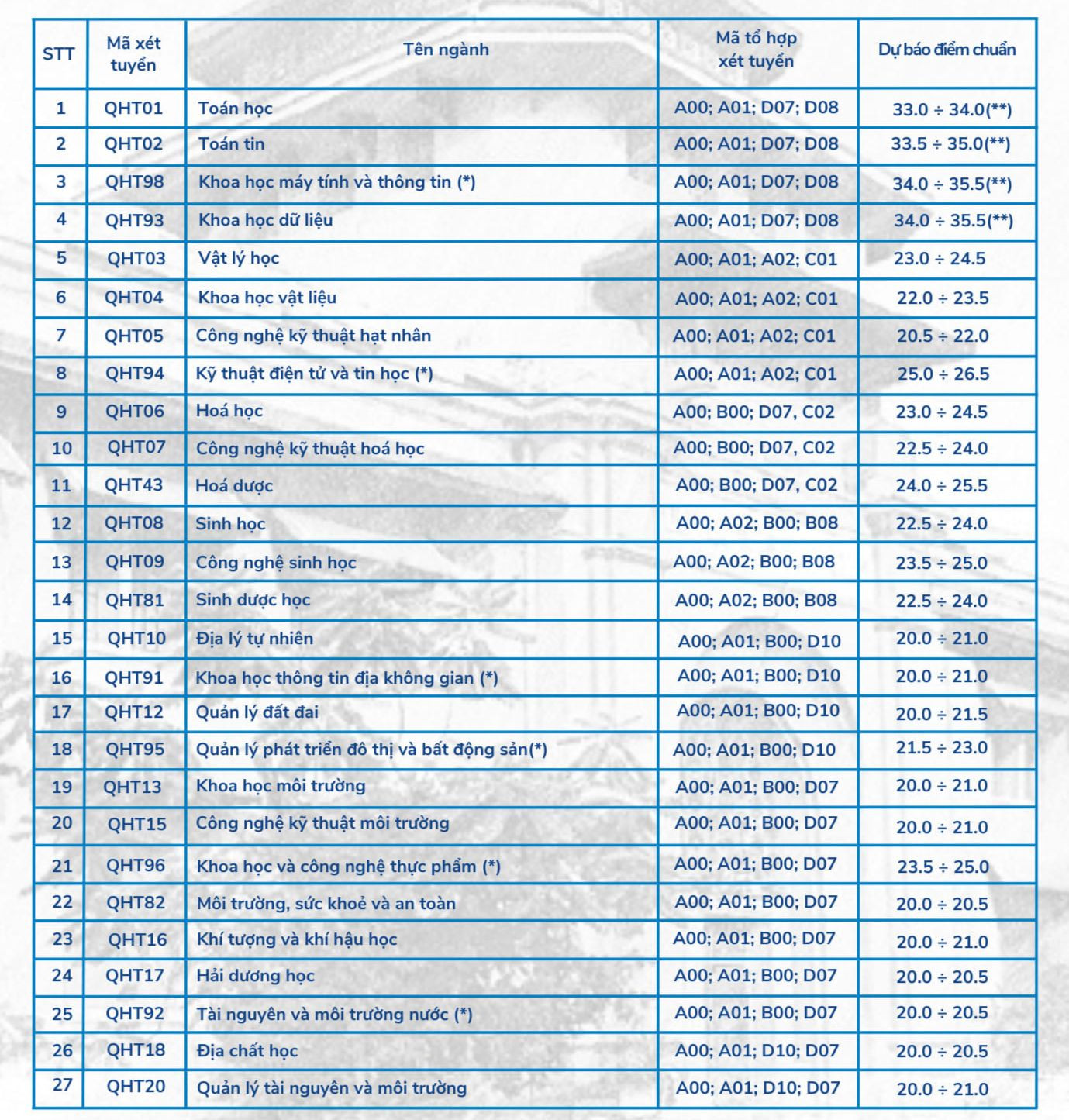 Cụ thể, mức điểm chuẩn dự báo các ngành của Trường Đại học Khoa học Tự nhiên, Đại học Quốc gia Hà Nội như sau: