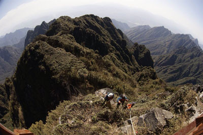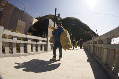 Bám theo triền núi, hàng tuần, đội kỹ sư bảo trì thuộc Công ty Dịch vụ Du lịch cáp treo Fansipan Sapa đi làm “nhiệm vụ đặc biệt” thu gom rác thải. Chỉ với sợi dây bảo hiểm, các chàng “Tazan” tinh nhuệ đu mình theo vách đá, lần theo từng bụi cây nhặt nhạnh, thu gom từng vỏ lon, chai nhựa, áo mưa, rác vương trên các ngọn cây do du khách đã xả trong nhiều năm qua.